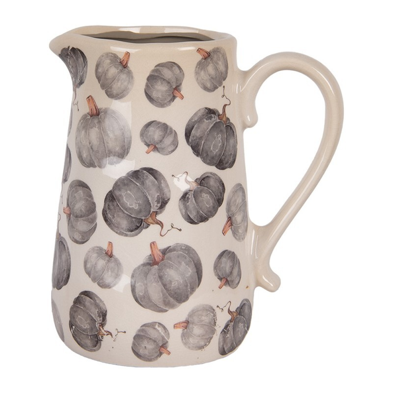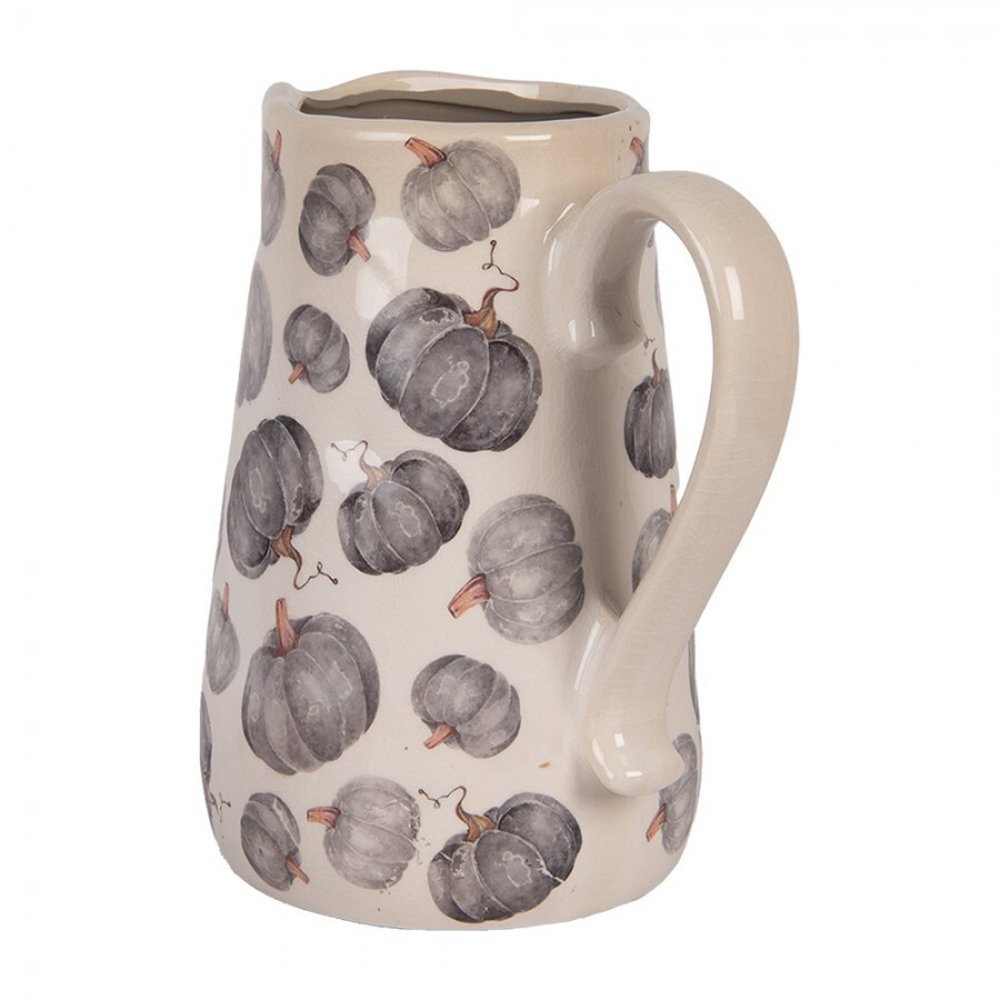 Krásný dekorativní béžový keramický džbán, zdobený barevným motivem dýně v selském stylu. Tento produkt je součástí série a je dostupný v různých velikostech.