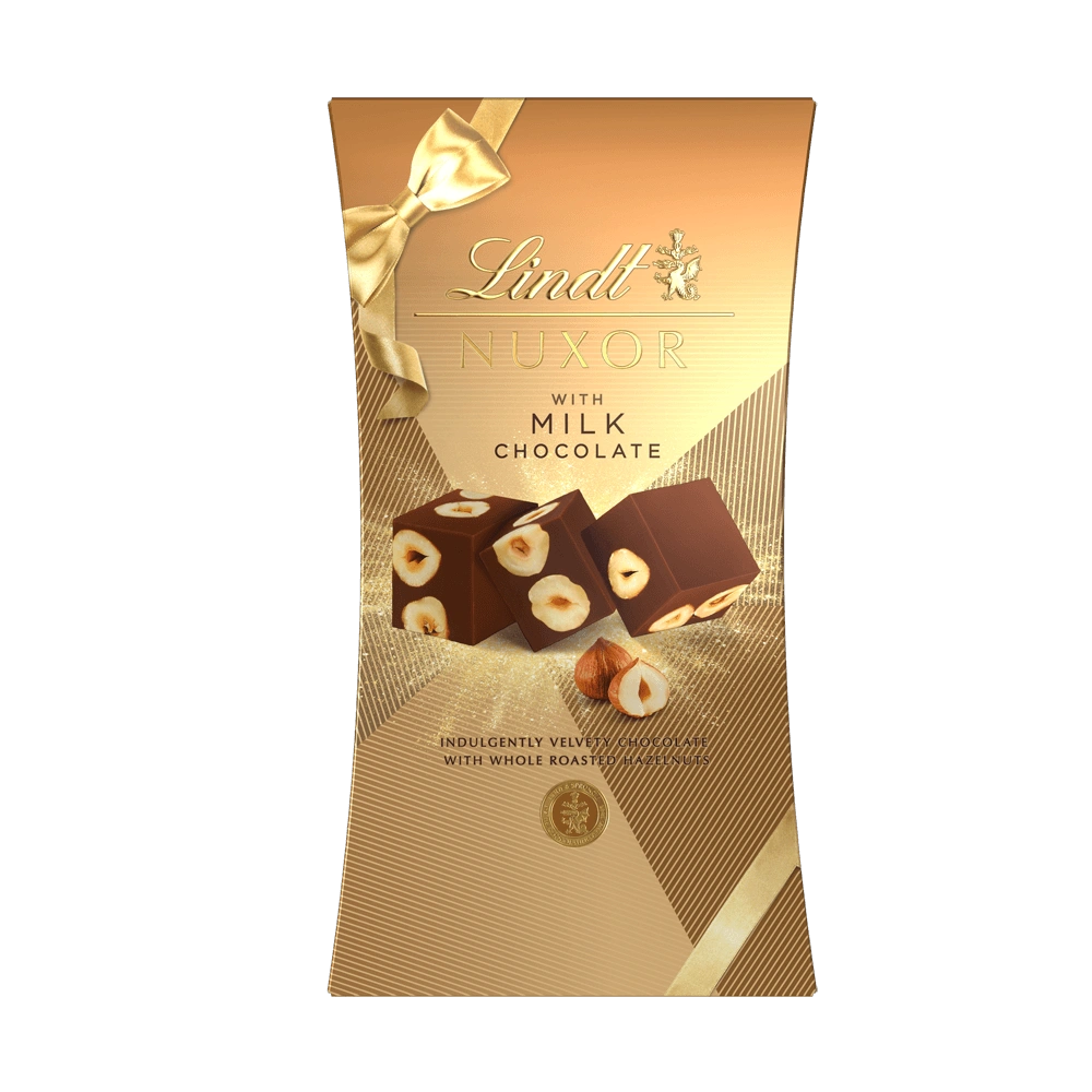 Oříšková mléčná čokoláda Gianduja s celými jádry lískových ořechů (20 %).